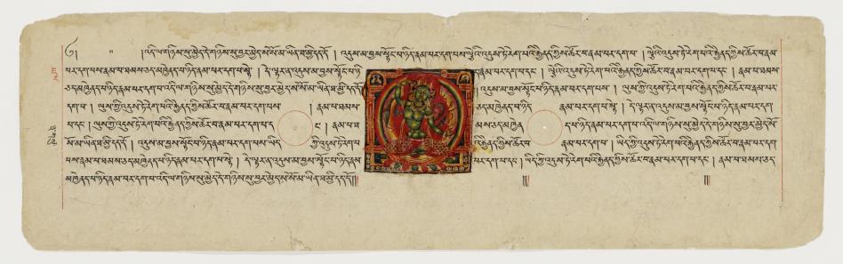 The Museum has a small but significant collection of Tibetan art including paintings and scrolls, as well as a single illuminated cover and frontispiece for a manuscript, but no examples of the actual illuminated folios or leaves from such manuscripts. Significant examples of this specific form of manuscript and illustration are rare. This exceptional folio is one of a pair, and the two together demonstrate the importance of this medium and form in the Tibetan culture, particularly when they are held in dialogue with the Tibetan paintings and thangka illustrating similar themes and stories, in our collection.