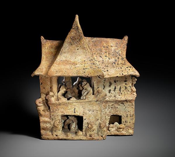 The work was accepted as a promised gift to The Metropolitan Museum of Art in 2004. The work was exhibited at the Metropolitan Museum from October 19, 2004 through April 3, 2005. This architecturally complex, ceramic structure features a feast for the dead with many intricate details. This model provides a rare opportunity to see architectural details that have not survived to the present day, such as plastered and painted thatched roofs. More importantly, the model depicts aspects of ritual and community life as ancient Nayarit artists conceived them. As such this work conveys a sense of place and activity in a way that few other objects do, an especially crucial feature for works of art from a region without contemporary texts.