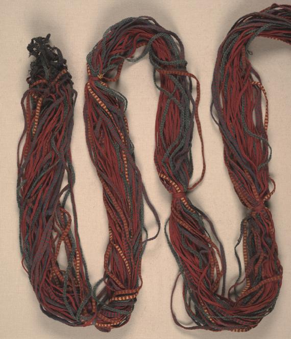 Although provenance is alleged to at least 1960, the DMA has been unable to substantiate the precise date of its departure from its probable country of origin because a previous owner is deceased. The Rawlins family lived in southern Peru during the 1950s, when they acquired objects representing ancient south coast Peruvian cultures such as Nasca and Ica. According to Myrtie R. Rice (phone conversation with Carol Robbins/DMA, 2/1/2012), her parents acquired the textile during the 1950s. Mrs. Rawlins (her mother) died in Peru in 1960, after which the family returned to Dallas. The textile is unusual, but it offers greater potential for study than for exhibition. The extensive shedding of fibers from the individual bands suggests that the textile may date from Middle Horizon or earlier rather than the Late Horizon, as it was conservatively catalogued originally.