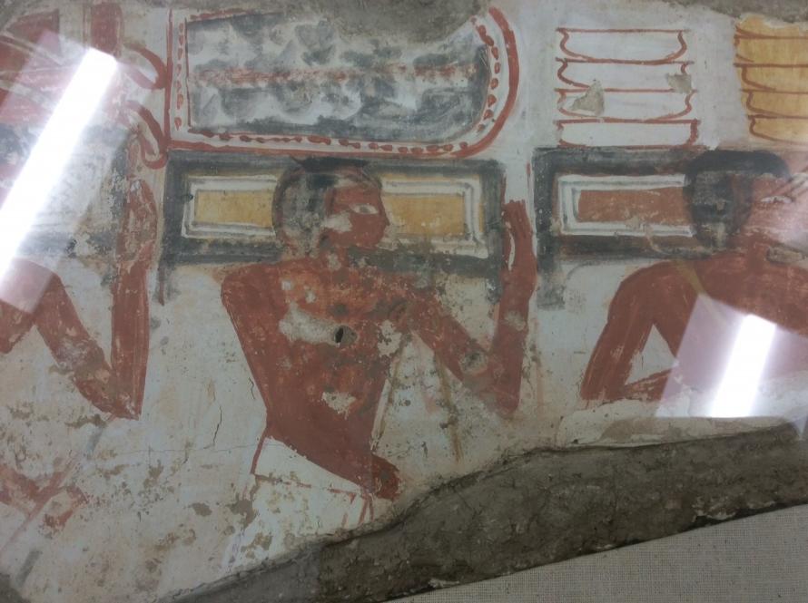 Note 1: Wall painting fragment showing three offering bearers moving to the right was photographed in situ between about 1926–40 as part of the Metropolitan Museum of Art, New York, Egyptian Expedition by Archaeological photographer and Egyptologist, Harry Burton (1879–1940) (The Metropolitan Museum of Art, Department of Egyptian Art Archives, MMA T 2784, copy in accession file) A portion of the fragment was also traced in situ sometime between 1920–40 by Nina M. Davies (1881–1965) and Norman de Garis Davies (1865–1941) (Oxford Griffith Institute, Davies MSS. 10.21.1, copy in accession file)