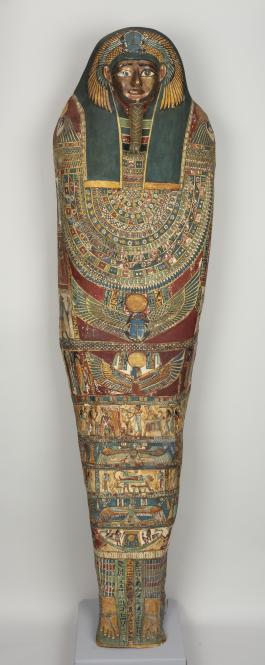 This object adds significantly to the Worcester Art Museum’s collection of Egyptian antiquities. As a late Ptolemaic example, it bridges the temporal gulf between the Museum's other two Egyptian sarcophagi, one dated to the New Kingdom, the other to the Roman period. Its richly painted surface, which includes scenes of mummification and the deceased's voyage through the afterlife, adds considerably to the Museum’s presentation of ancient Egyptian beliefs and funerary practices.