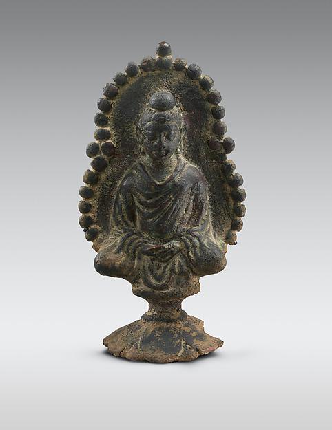 The work has provenance established to 1981 when it was published in Von Schroeder as from a “Private Collection, photo courtesy of The Metropolitan Museum of Art.” The work was exhibited at the Metropolitan Museum in 1982. A diminutive image of a Buddha in meditation, on a lotus petal waisted pedestal, framed by a pearl-bordered aureole. The distinctive folds of the upper robe, pleated with V-front in a style familiar from late Kushan stone versions of this subject, points to an early date for Gandharan metal imagery, perhaps 4th century. The early date assigned to this work adds to its significance. The Museum has the premier collection of Gandharan art in the United States, including a uniquely important early bronze seated Buddha and bronze reliquary. This finial depiction of the Buddha lies in direct descent from such early works, and allows the Metropolitan Museum to demonstrate to the public the way in which early Buddha imagery evolved over these early centuries.