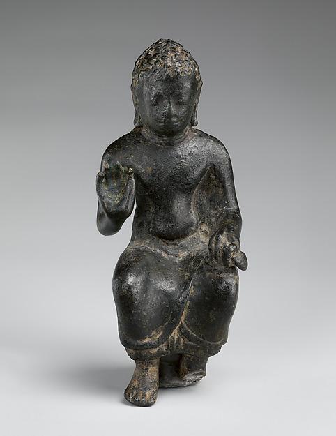 This work was first published in a Thai publication in 1965. The work has provenance established to 1978, when it was exhibited and published with an accompanying description and photograph in the catalog. The work was exhibited from 1980 to 1985 at the Art Institute of Chicago, and it was published in 2012 when it was offered for sale at auction by Sotheby’s. It was exhibited and published by the Metropolitan Museum in the 2014 exhibition Lost Kingdoms. This miniature icon of a Buddha expounding the dharma has the distinction of being among the earliest renderings of this subject known from Mon territories. The preaching Buddha seated with pendant legs became the signature icon of the monumental stupas built by the Mon state in 8th century central Thailand. The importance of this miniature icon of a Buddha lies in both its serving as an early prototype for such monumental Buddhas, and the likelihood that it is the earliest version of this subject known.